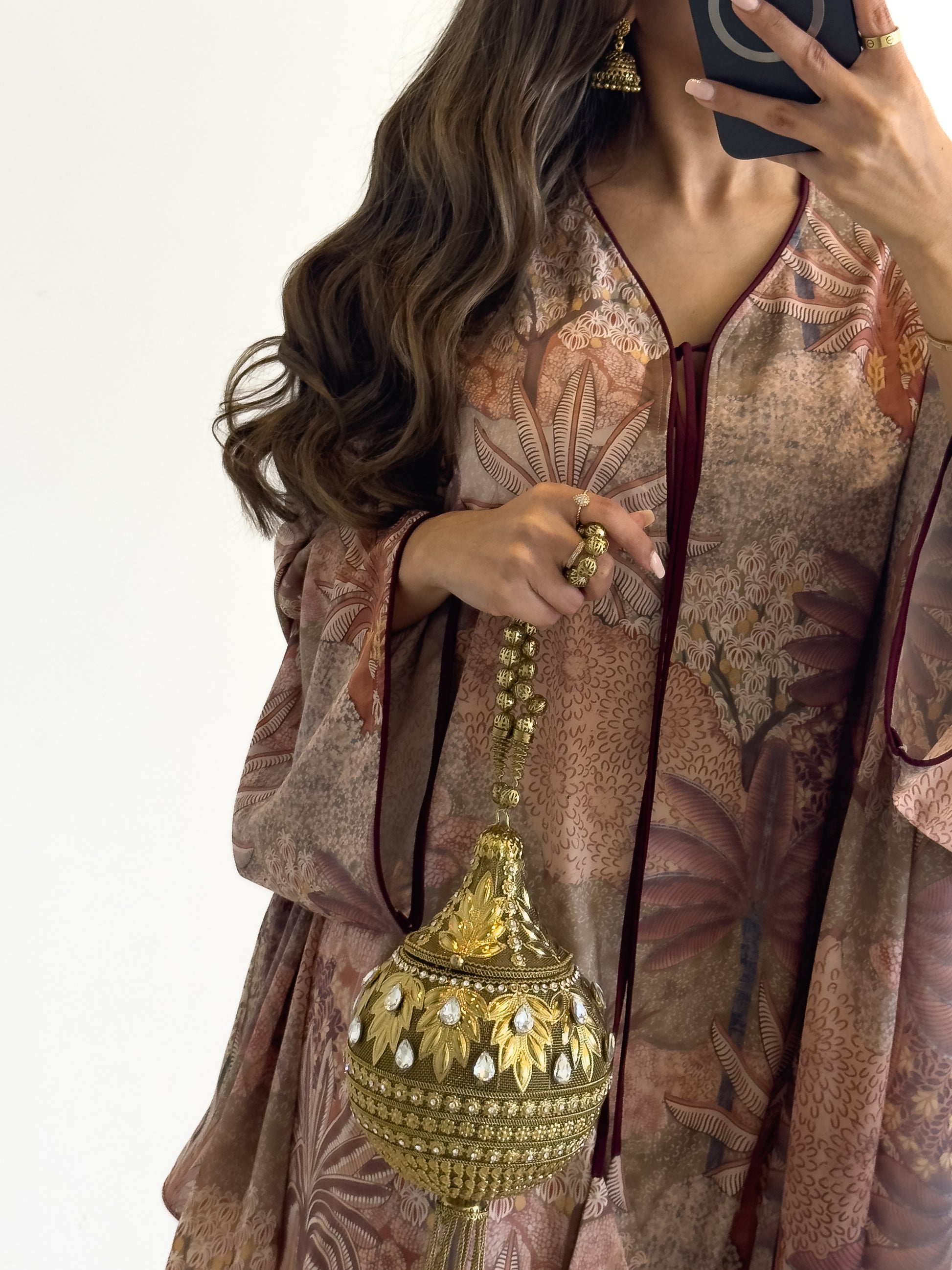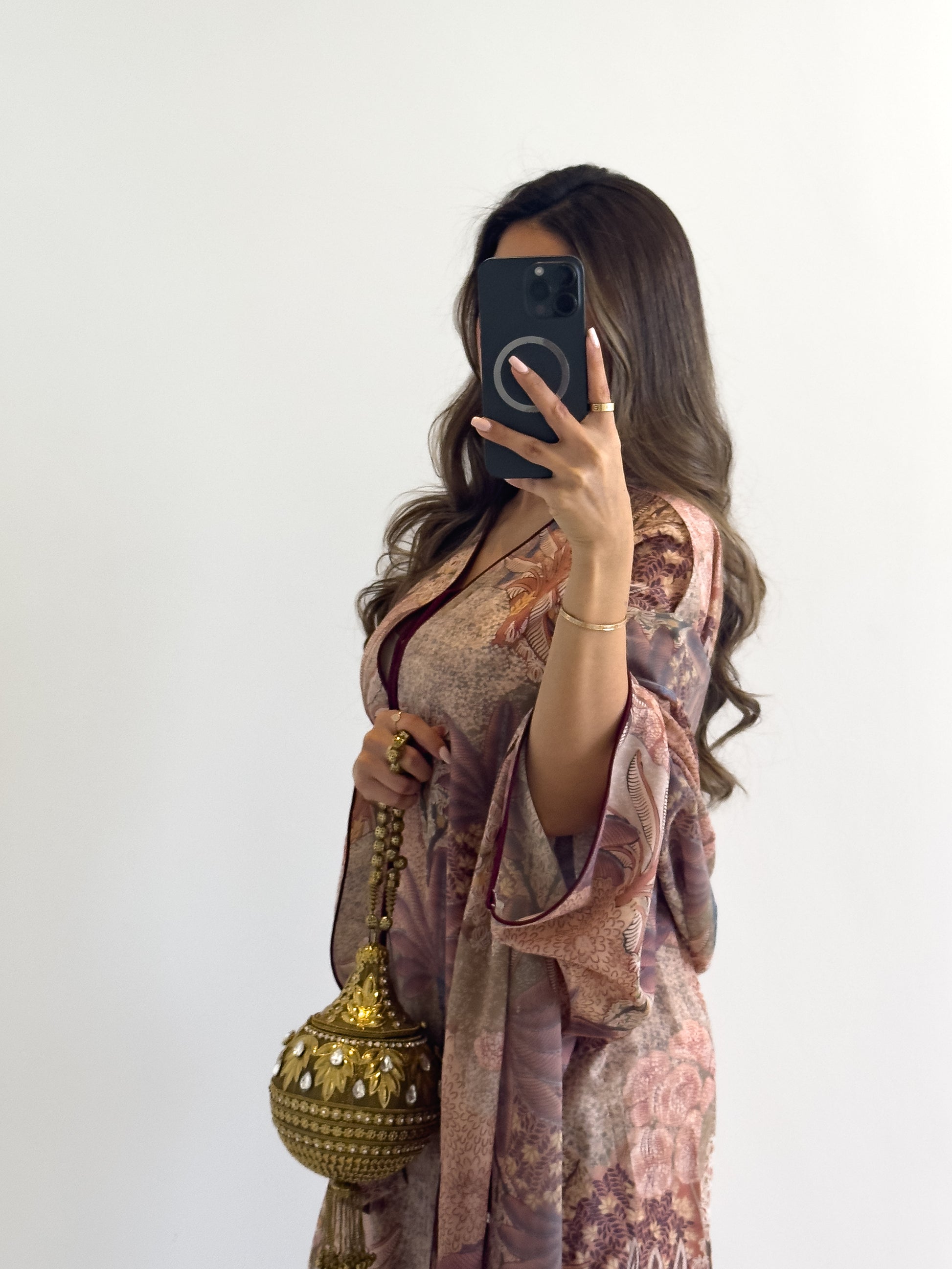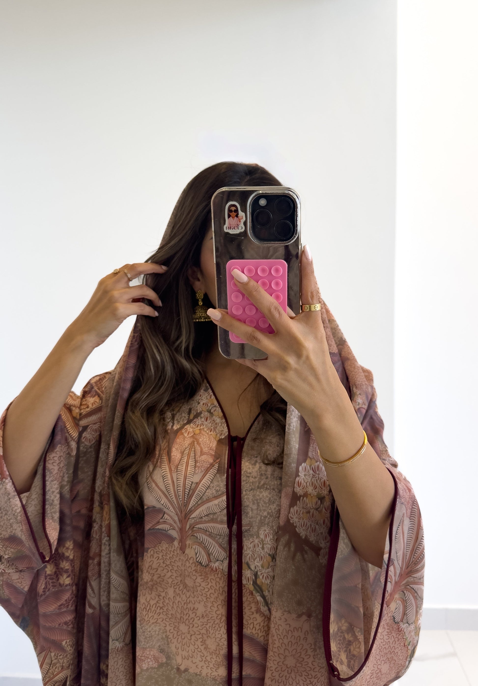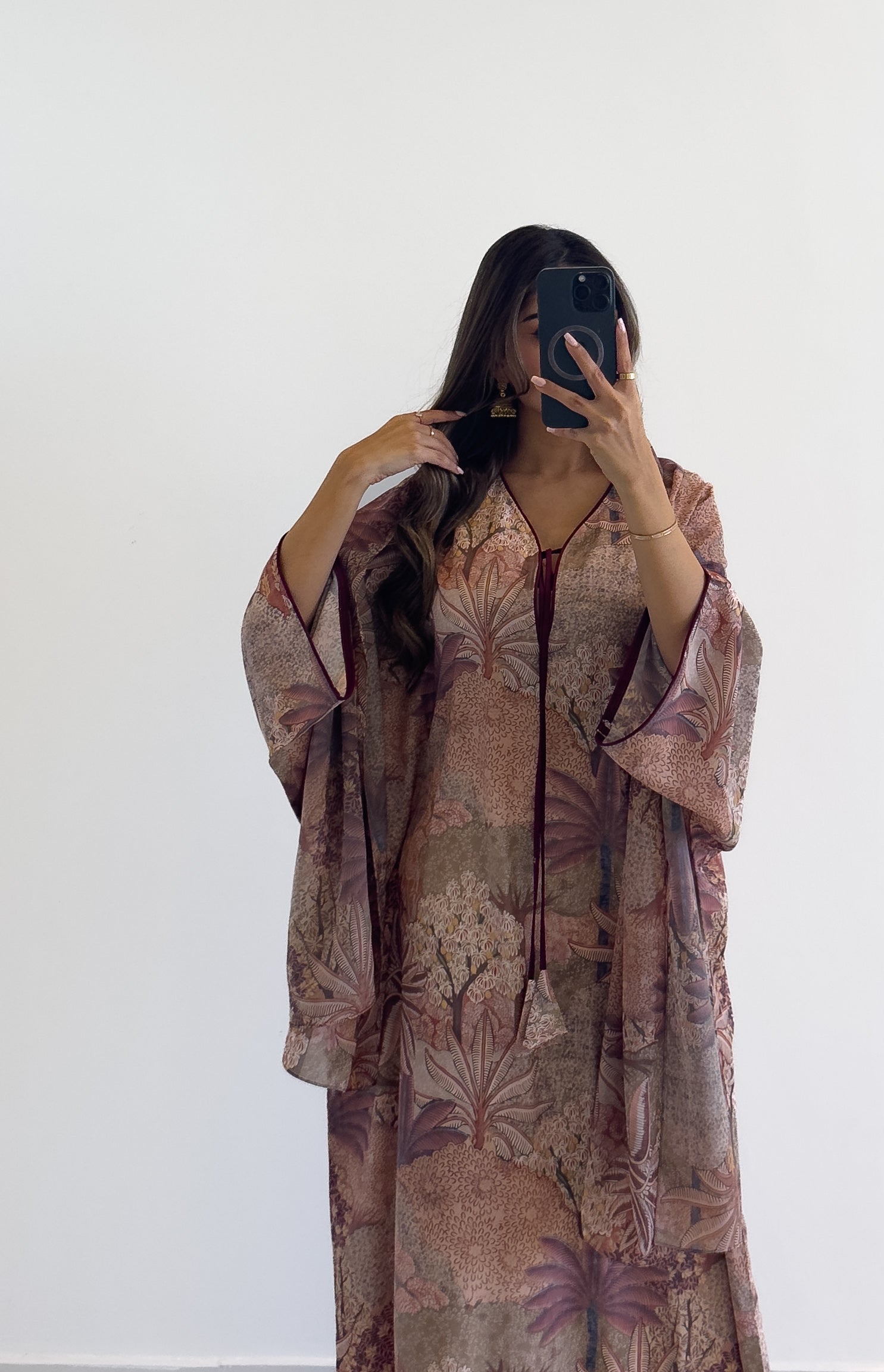 Free size lightweight jalabiya in a soft cotton-crepe blend, paired with a matching sheila — featuring a fabric specially designed and printed for Aura.