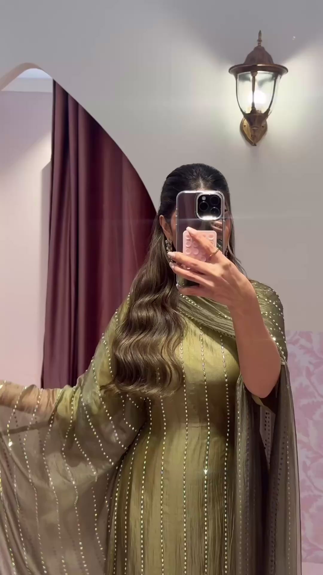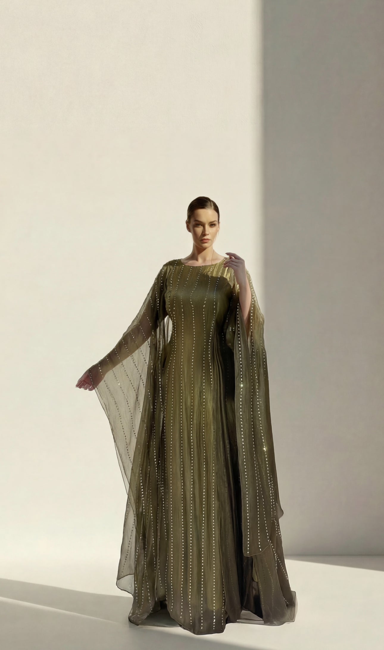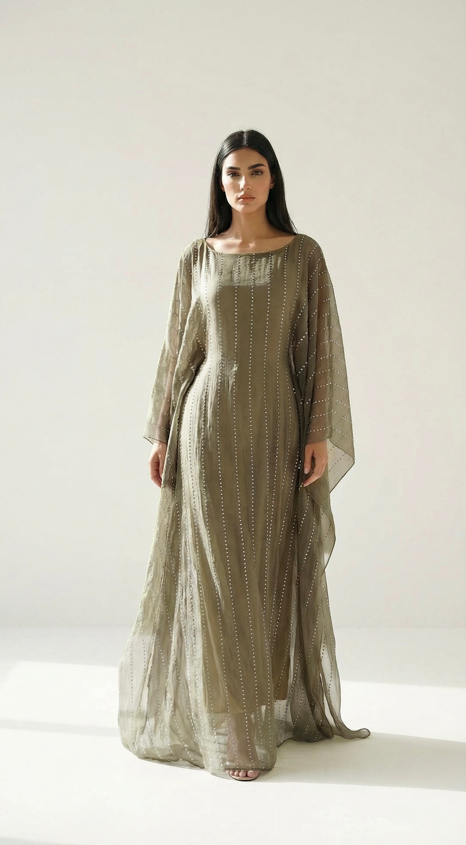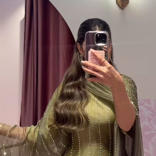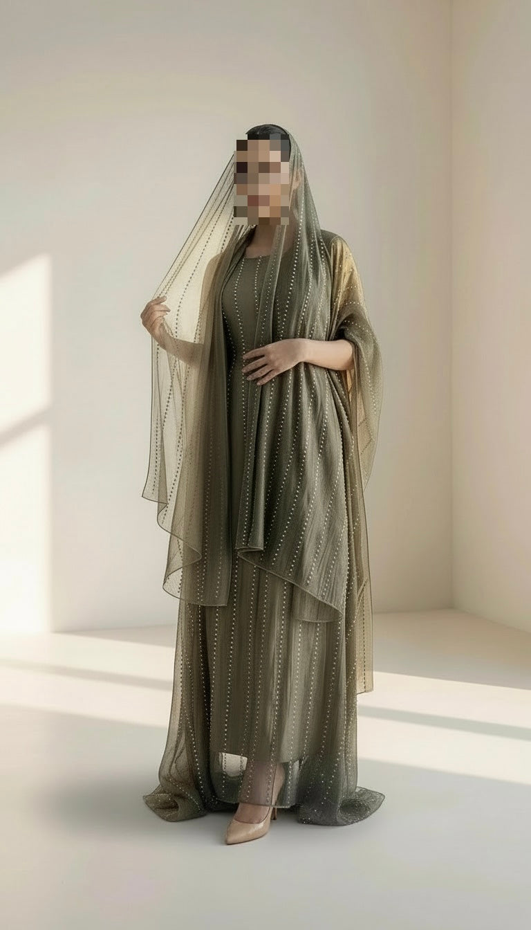 Lightweight organza piece adorned with crystal line detailing, featuring a structured inner belt and fixed inner lining. Comes with a matching shaila that can also be worn as a scarf.